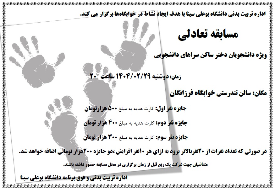 به اطلاع می رساند اداره تربیت بدنی و فوق برنامه دانشگاه در نظر دارد با هدف ایجاد نشاط مسابقه تعادلی ویژه دانشجویان دختر ساکن در سراهای دانشجویی همراه با جوایز به نفرات برگزیده را برگزار نماید.