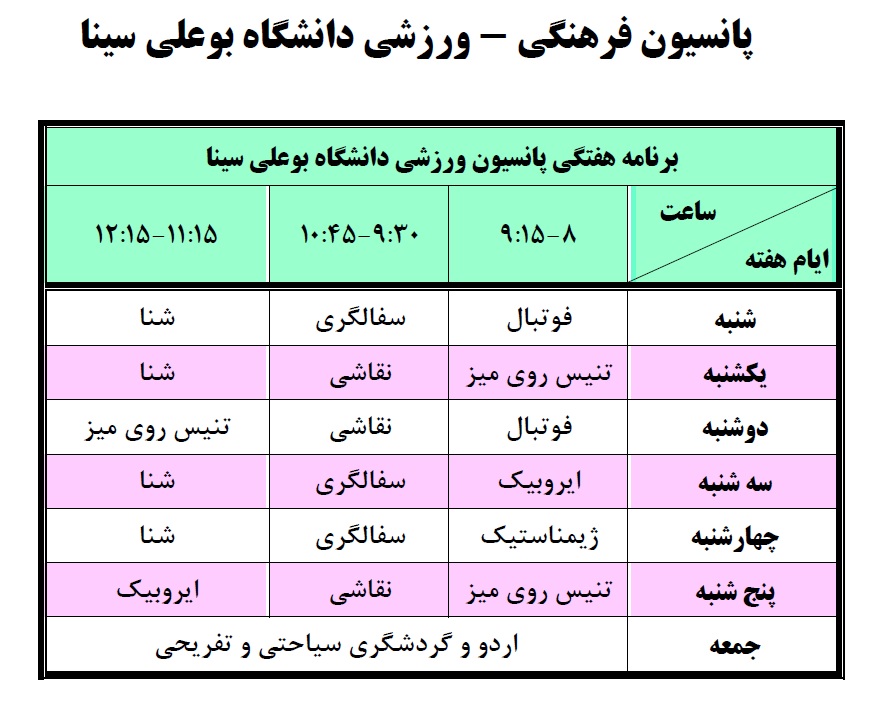 اداره کل تربیت بدنی دانشگاه بوعلی سینا درنظر دارد پانسیون فرهنگی ورزشی را بمدت ۴۵ روز و سه جلسه در هفته در قالب کلاس های آموزش شنا، فوتبال، ژیمناستیک، پینگ پنگ، سفالگری، نقاشی و ایروبیک ارائه نماید.