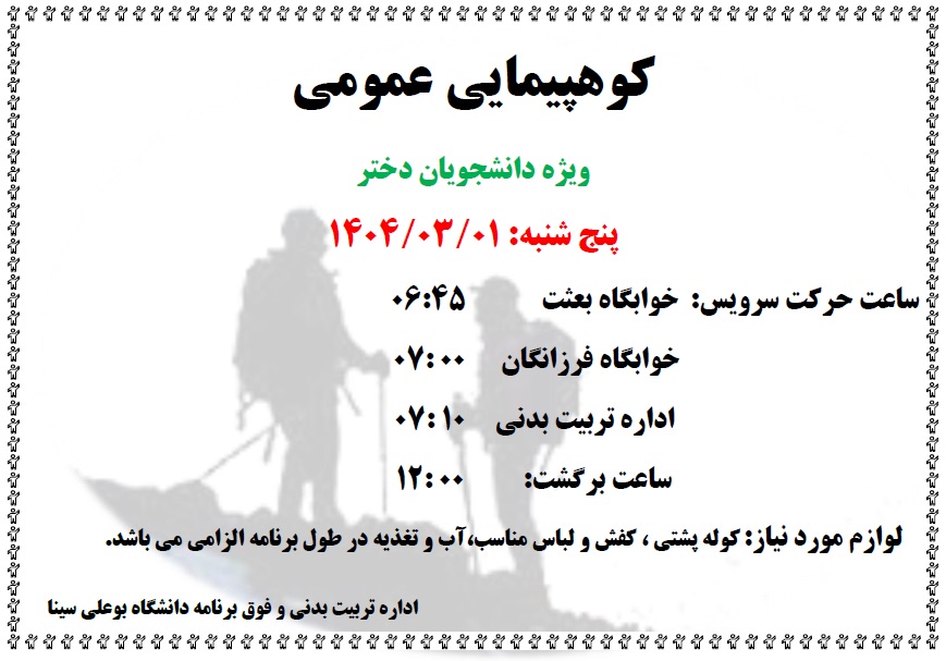 اداره تربیت بدنی و فوق برنامه دانشگاه در نظر دارد یک برنامه کوه پیمایی ویژه دانشجویان دختر را در ارتفاعات الوند برگزار نماید.