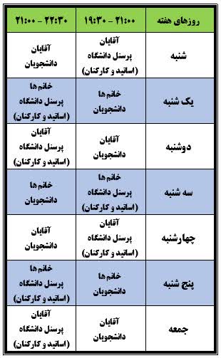 به اطلاع دانشگاهیان گرامی می رساند برنامه استخر دانشگاه در ماه مبارک رمضان مطابق با جدول زیر می باشد.