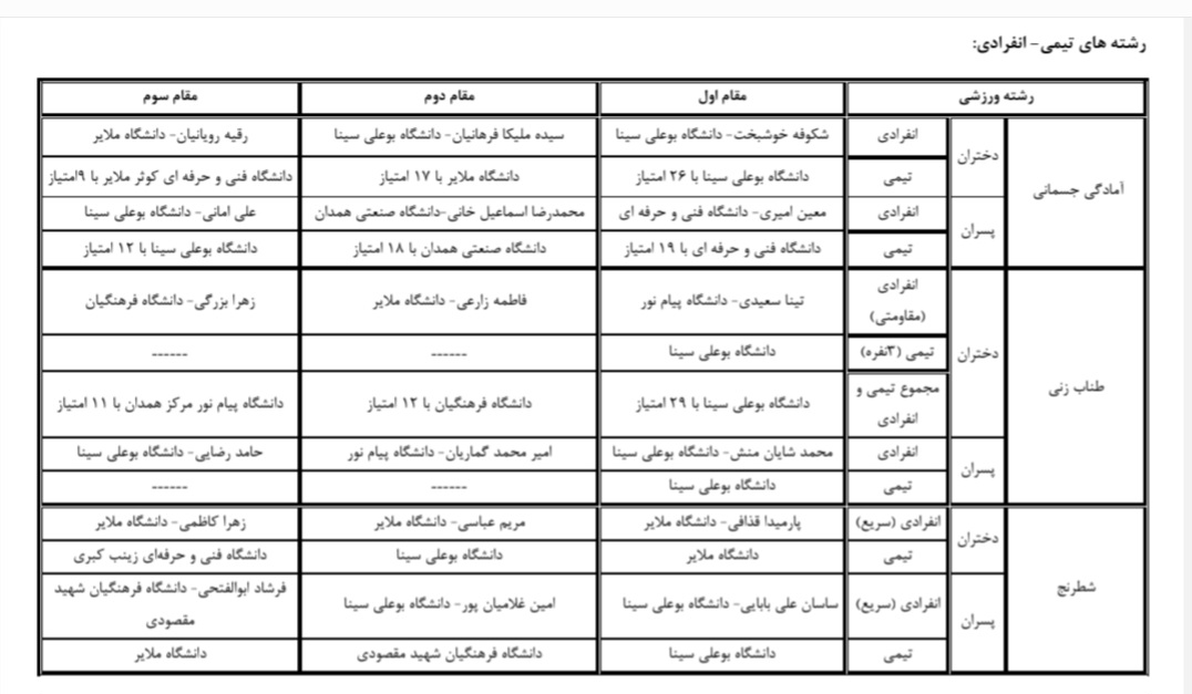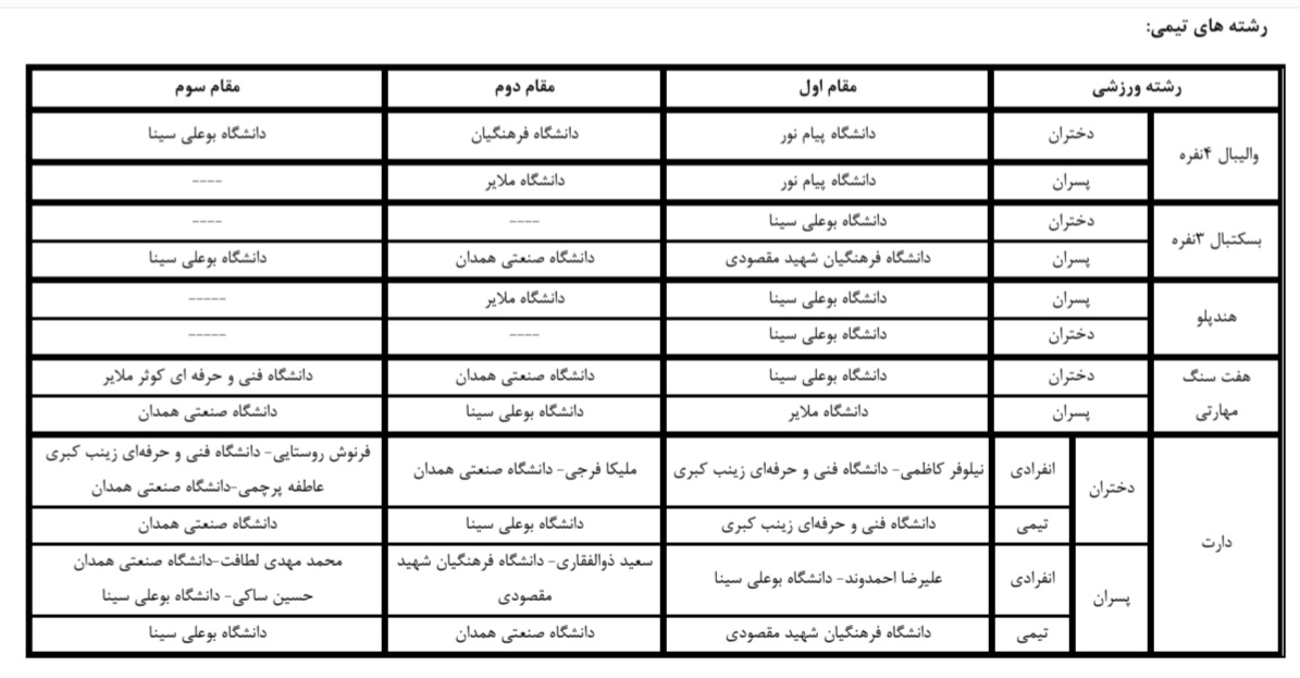مسابقات ورزش های همگانی استان همدان انتخابی المپیاد کشوری سال آینده با حضور ۴۰۰ نفر از ورزشکاران در ۱۶ رشته مختلف ورزشی از ۶ دانشگاه استان همدان از جمله دانشگاه بوعلی سینای همدان، دانشگاه صنعتی همدان، دانشگاه ملایر، دانشگاه فنی و حرفه ای شهید مفتح، دانشگاه پیام نور و دانشگاه فرهنگیان به میزبانی دانشگاه بوعلی سینای همدان طی دو روز در دو بخش دختران و پسران با همکاری اداره کل تربیت بدنی و فوق برنامه دانشگاه و هیئت ورزش های دانشگاهی استان همدان در تاریخ 18 و 19 اسفند ماه ۱۴۰۱ برگزار گردید. نتایج کامل این مسابقات در دوبخش رشته های تیمی و رشته های انفرادی دختران و پسران در جداول ذیل قابل مشاهده است