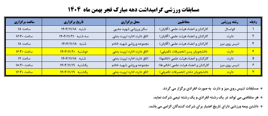 معاونت فرهنگی و اجتماعی-معاونت دانشجویی برگزار می کنند: مسابقات ورزشی گرامیداشت دهه مبارک فجر ویژه کارمندان و اعضای هیات علمی و دانشجویان در هر دو بخش آقا و خانم